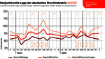 Im November 2025 bewerteten die vom ifo Institut befragten Entscheider der Druck- und Medienunternehmen ihre aktuelle Geschäftslage schlechter als im Vormonat. Die Einschätzungen im Hinblick auf die nächsten 6 Monate fielen in diesem Monat hingegen optimistischer aus. Die Ausprägungen der aktuellen und erwarteten Geschäftslage bestimmen die Entwicklung des Geschäftsklimas, das einen guten Vorlaufindikator für die Produktionsentwicklung der Druck- und Medienindustrie darstellt.